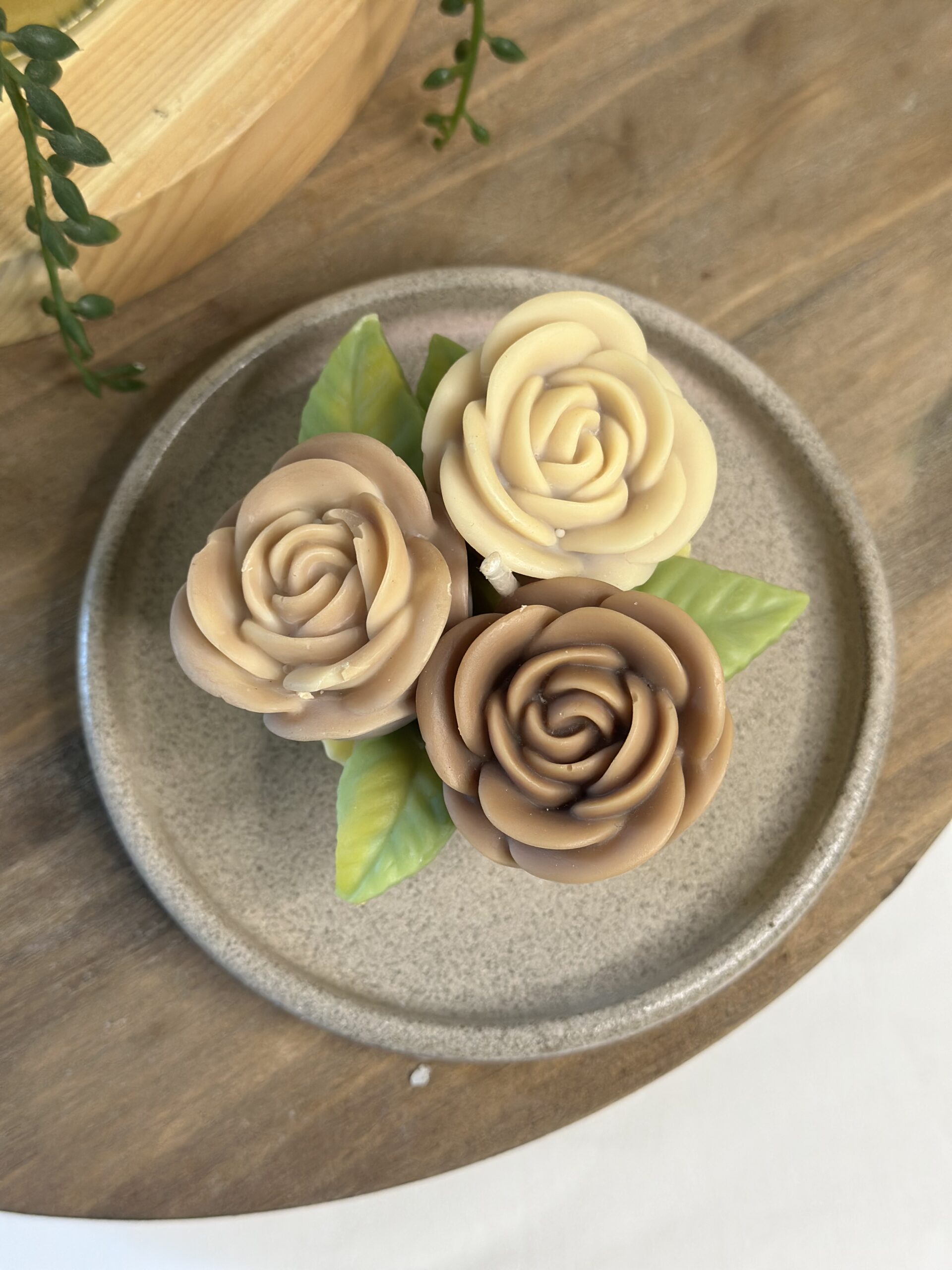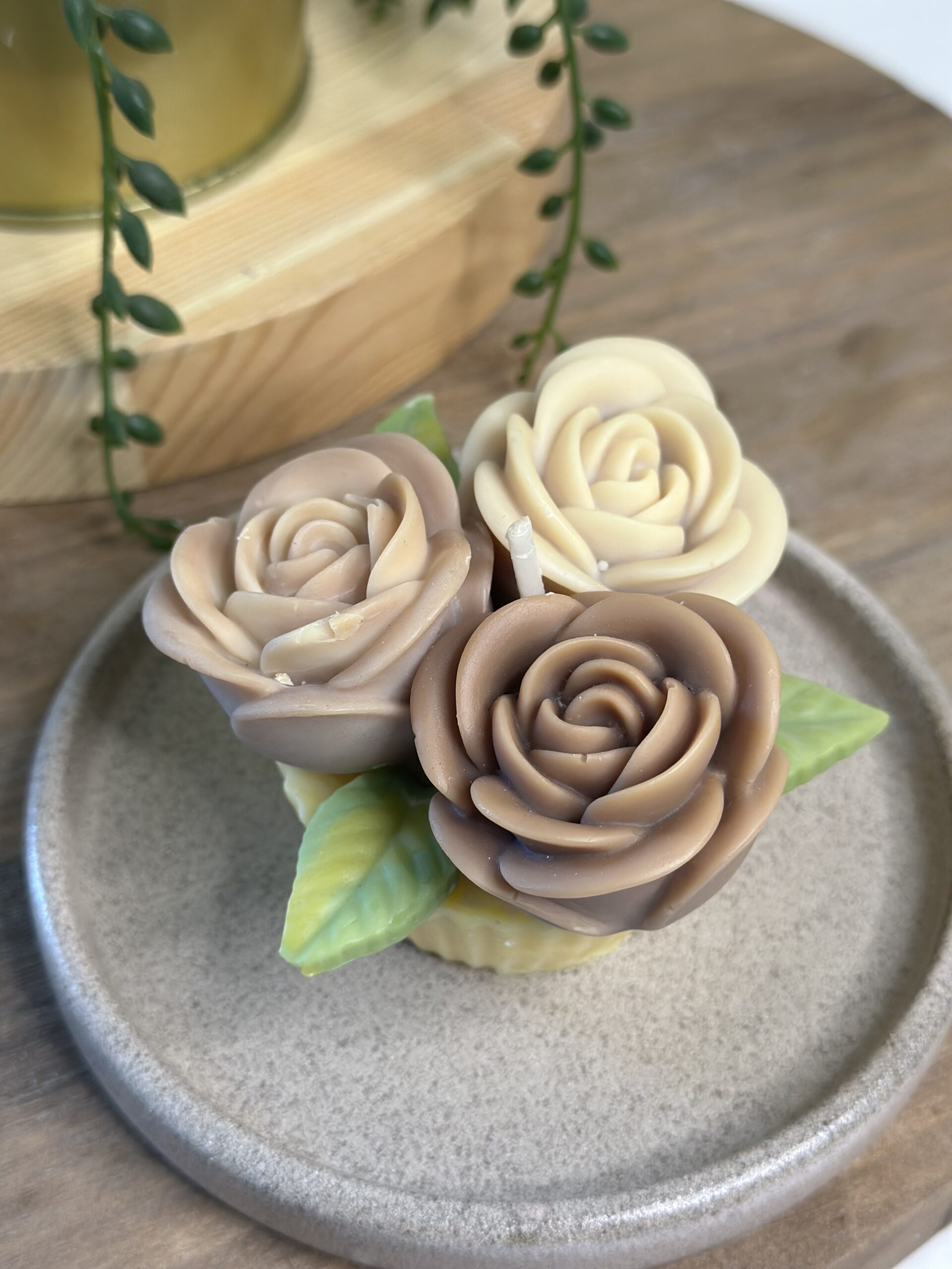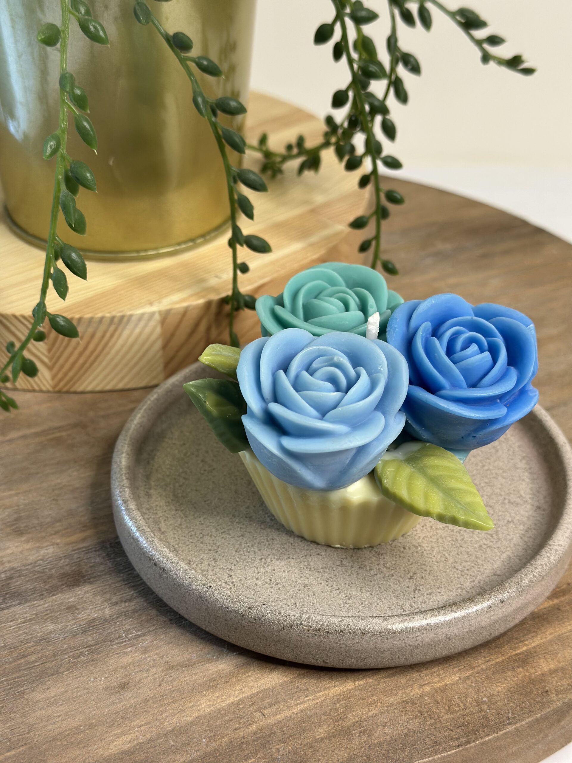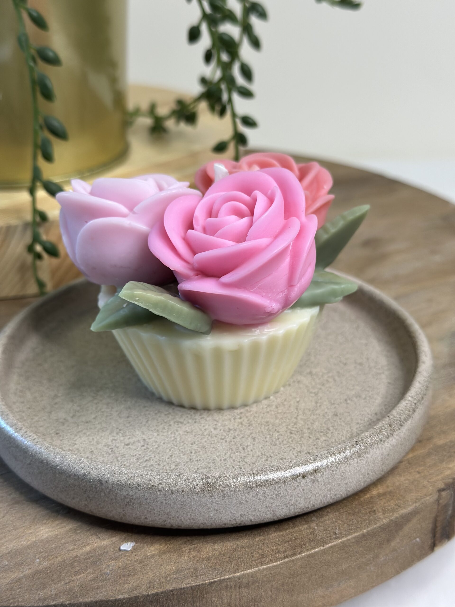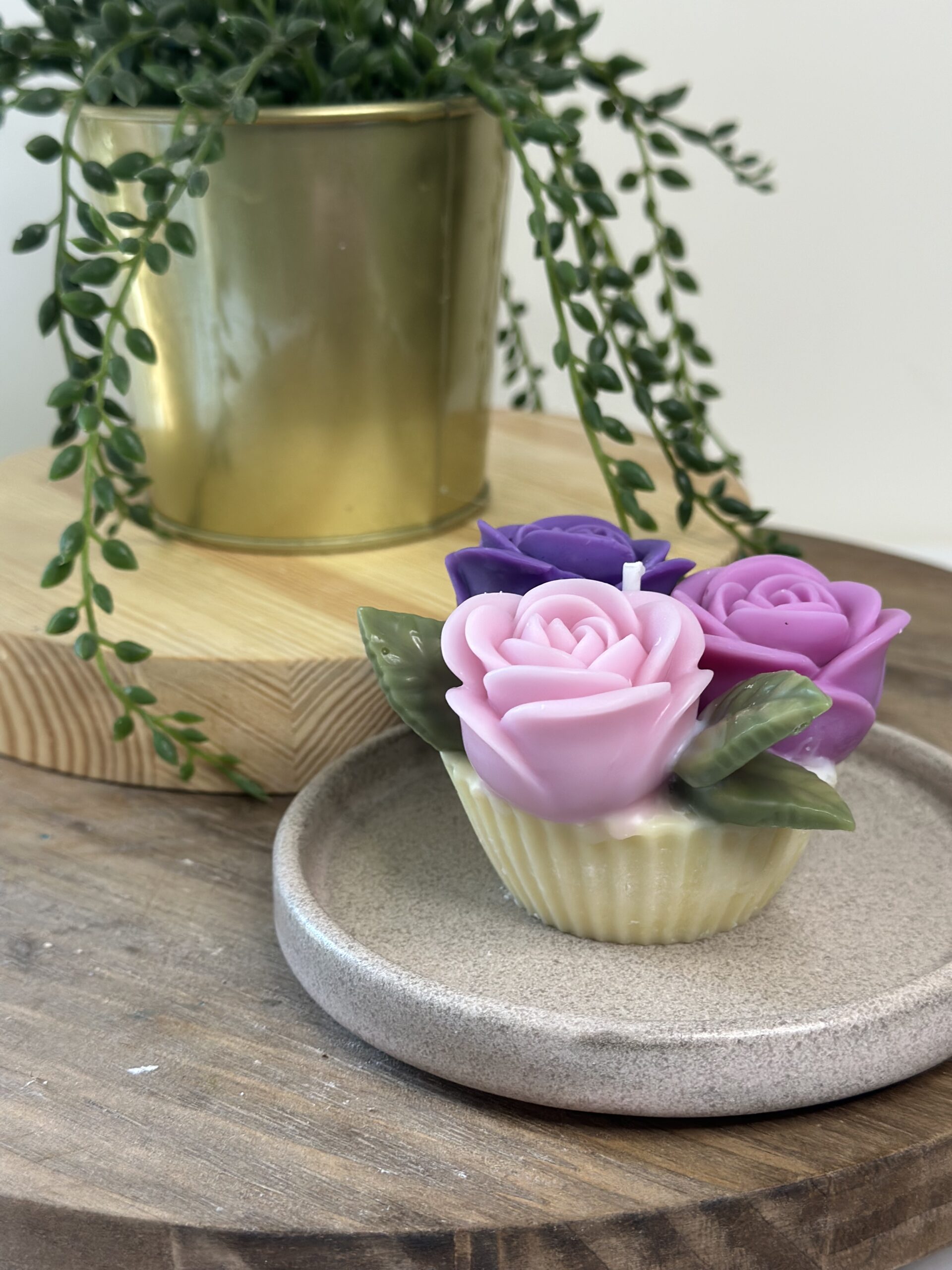 Chaque bougie prend la forme d’un cupcake floral : une base gourmande façon cupcake, surmontée de feuilles et de fleurs finement sculptées en cire.